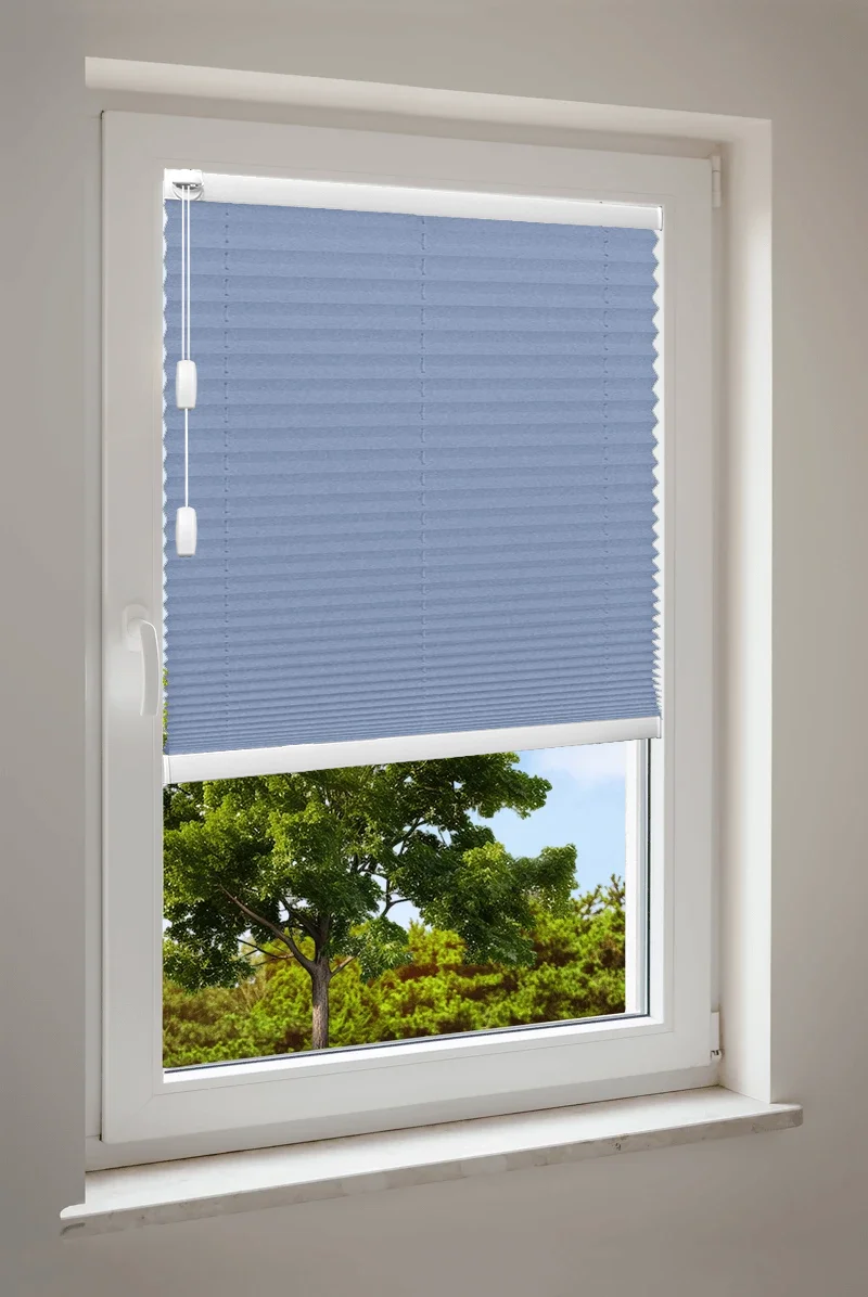Maßgefertigtes Cosiflor® F1 Plissee in stilvollen blauen Stoffvarianten – ideal für eine frische und moderne Raumgestaltung