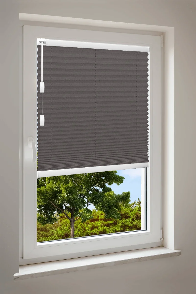 Maßgefertigtes Cosiflor® F1 Plissee in stilvollen braunen Stoffvarianten – ideal für eine warme und natürliche Raumgestaltung